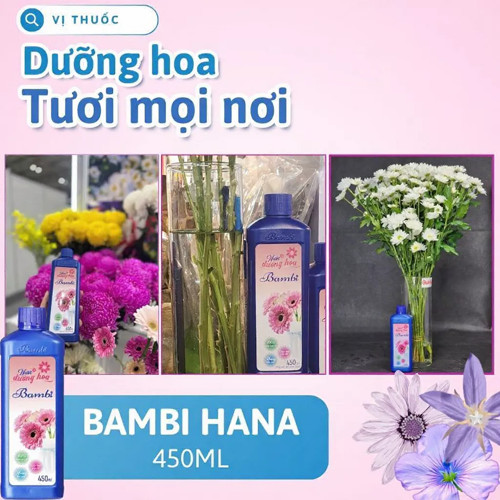 Nước dưỡng hoa Bambi 450ml là một sản phẩm đặc biệt giúp giữ hoa tươi lâu hơn và giảm mùi khó chịu. Với công thức độc đáo, sản phẩm này giúp: