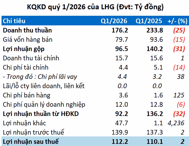 Một chi tiết đáng lưu ý là dù doanh thu cốt lõi sụt giảm, lợi nhuận ròng của LHG vẫn ghi nhận mức tăng nhẹ, đạt hơn 112 tỷ đồng. Tuy nhiên, sự tăng trưởng này không đến từ hoạt động vận hành chính mà nhờ vào khoản thu nhập khác tăng vọt lên gần 58 tỷ đồng (gấp 53 lần cùng kỳ), trong đó có hơn 57 tỷ đồng là tiền bồi thường đất.