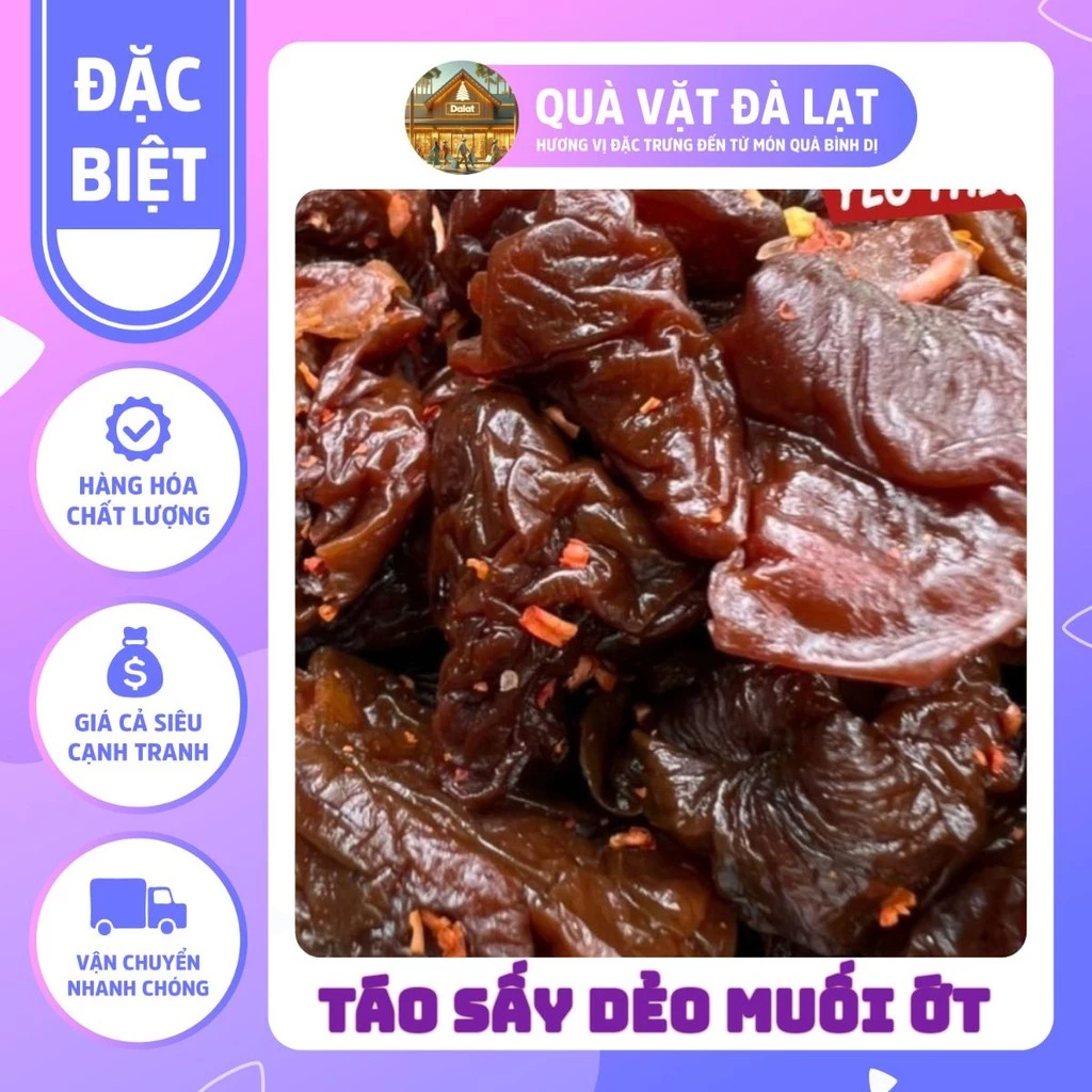 TÁO SẤY MUỐI ỚT, DẺO THƠM TỪNG SỚ THỊT, CHUA CHUA, CAY CAY, NGỌT NHẸ – QUÀ VẶT ĐÀ LẠT là một trong những sản phẩm táo sấy muối ớt nổi tiếng tại Đà Lạt. Sản phẩm này không chỉ giữ được hương vị đặc trưng của táo sấy Đà Lạt mà còn có thêm vị cay và mặn tinh tế từ muối ớt. Với mức giá 37.000 VND (giá gốc 48.100 VND), đây là một lựa chọn tiết kiệm và đáng thử.